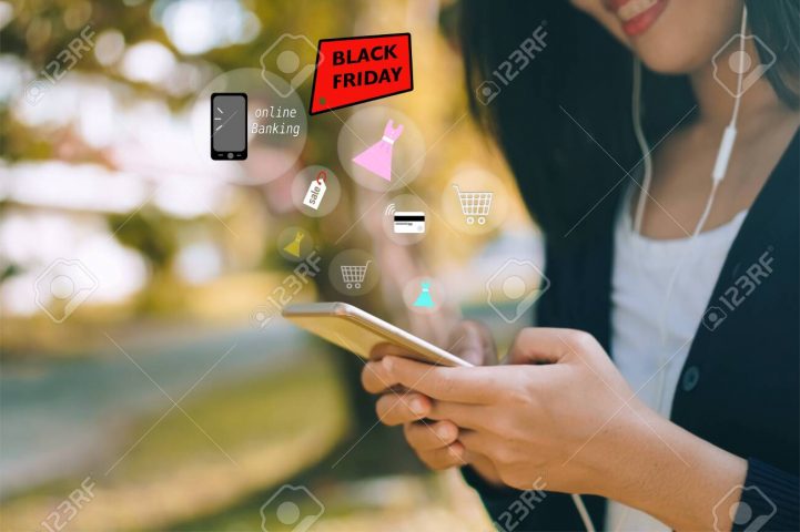 Women hand using smartphone do online selling for people shopping online in black friday with chat box, cart, dollar icons pop up. Social media maketing concept.